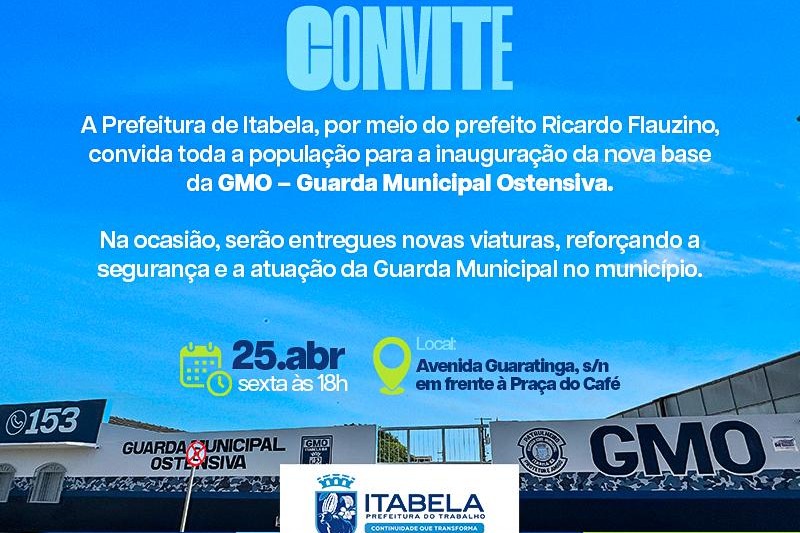 A Prefeitura de Itabela realiza nesta sexta-feira, dia 25 de abril, a inauguração da nova base da Guarda Municipal Ostensiva (GMO). A cerimônia acontecerá às 18h, na Avenida Guaratinga, s/n, em frente à Praça do Café.