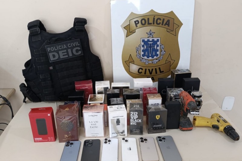 Os policiais seguiram até o local indicado e encontraram o suspeito em posse de diversos itens furtados. Ao todo, foram recuperados seis aparelhos celulares (modelos iPhone), 23 perfumes importados, dois carregadores portáteis, duas furadeiras e uma caixa de som da marca JBL. Todo o material foi devolvido ao proprietário mediante registro formal.