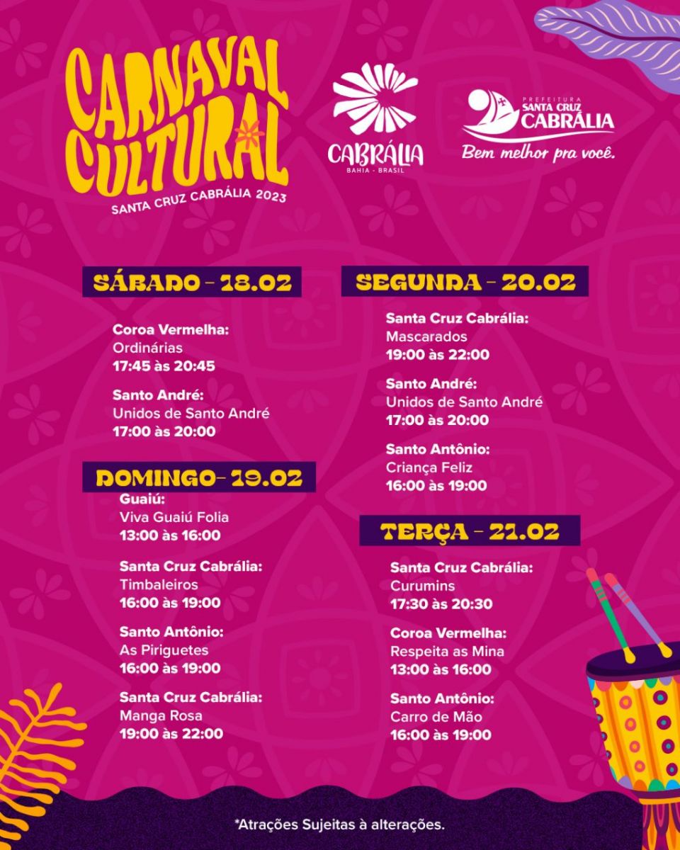 Já começou a contagem regressiva para o Carnaval Cultural de Santa Cruz Cabrália, que vai tomar conta das ruas da cidade e dos principais distritos entre os dias 18 a 22 de fevereiro, trazendo na essência o resgate da cultura, quando famílias, amigos e crianças se fantasiam e brincam na verdadeira tradição carnavalesca.